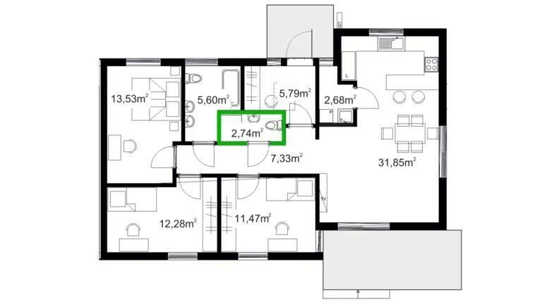 Posiada dwie łazienki, trzy sypialnie, przestronny przedsionkiem i pomieszczenie gospodarcze spełniającym funkcje spiżarki i pralni.